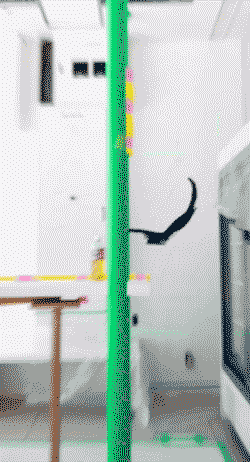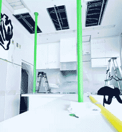 それは、そのまま空間にも関連していきます。蛍光のバー(線)はそのまま、空間の中の単管パイプになり、手書きの黒い線は、そのまま拡大し、手書きで直接壁面、天井に描いています。