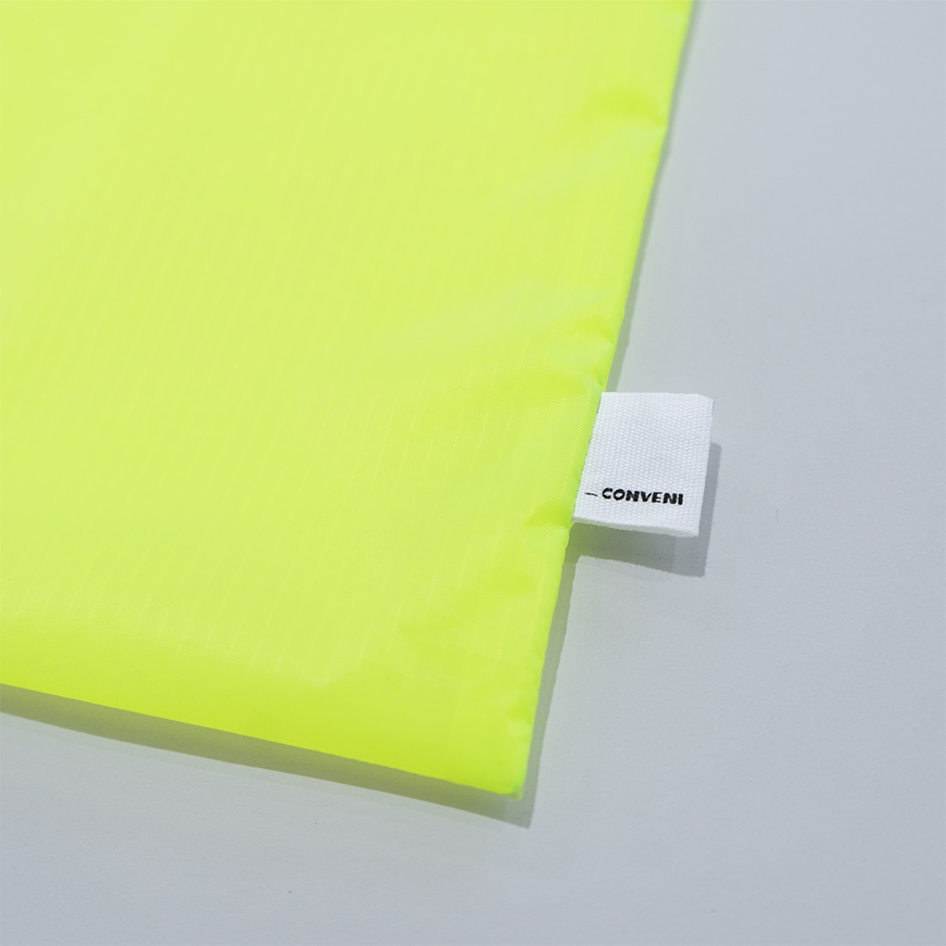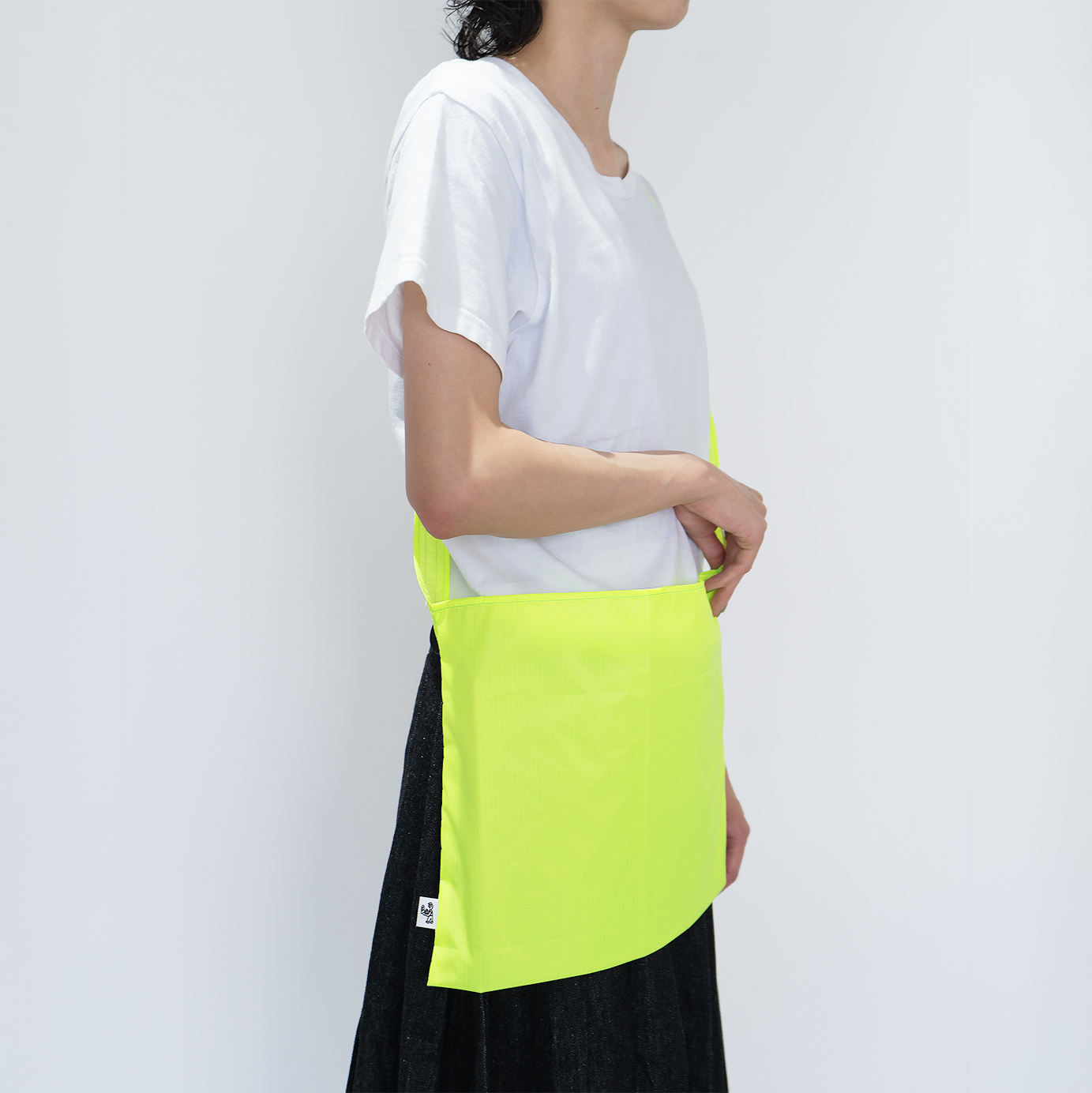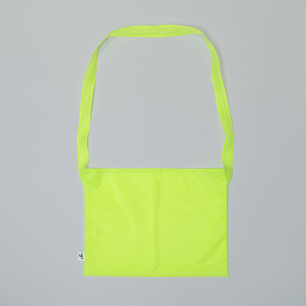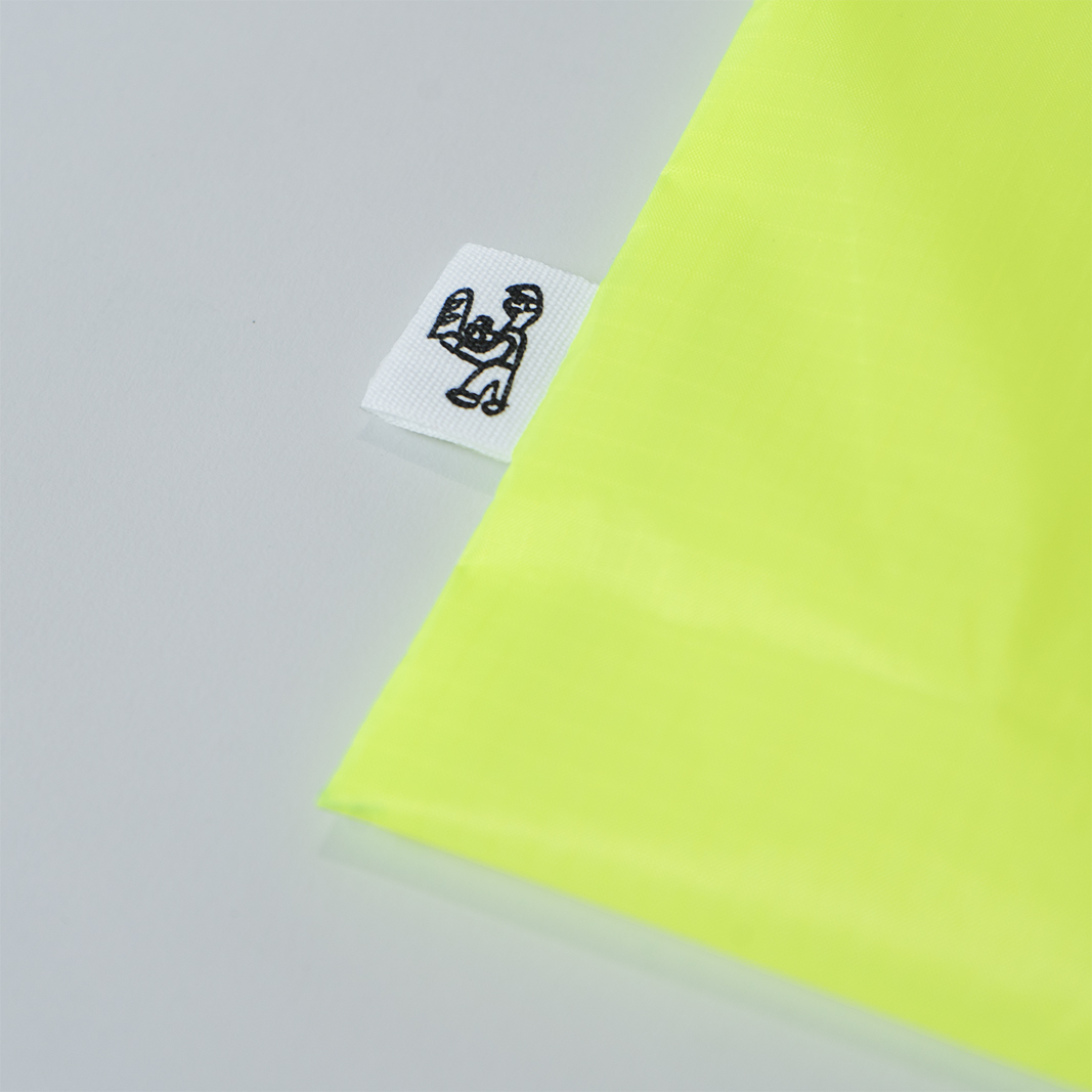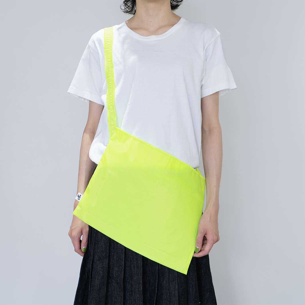 スタッフの方のユニフォームは、蛍光のグリーンの布を元にオリジナルサコッシュ(非売品)を作成しています。肩に掛ける事で、蛍光グリーンのバー(線)が強調される事を考えています。