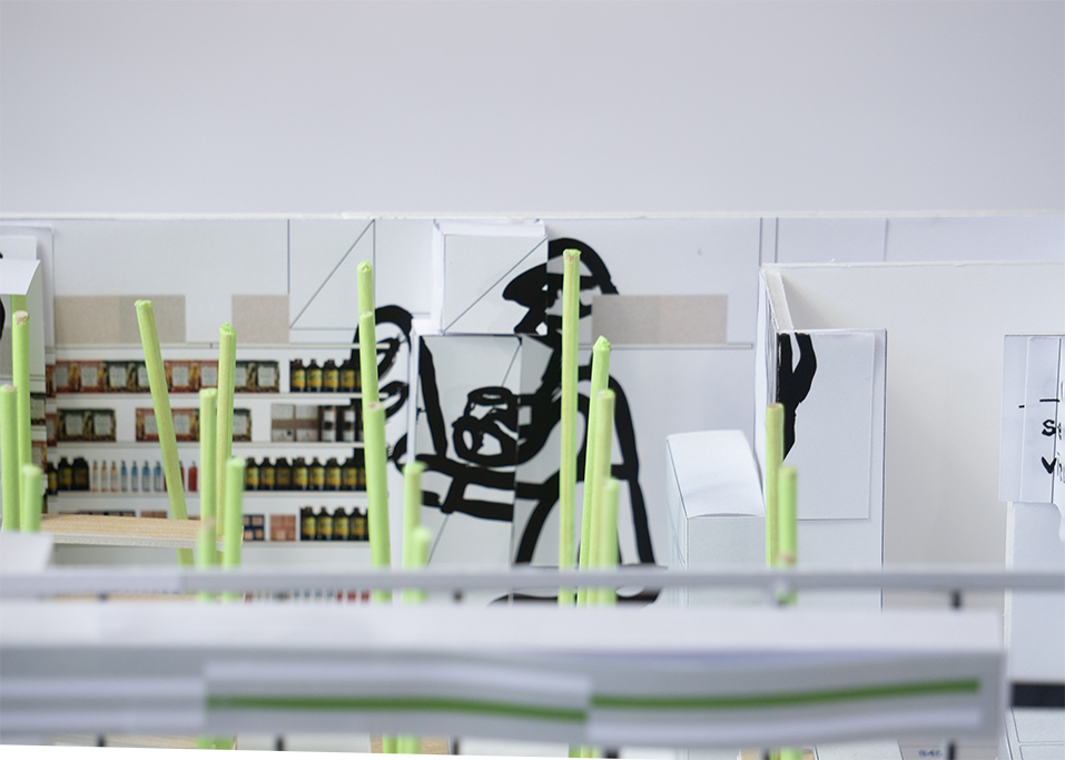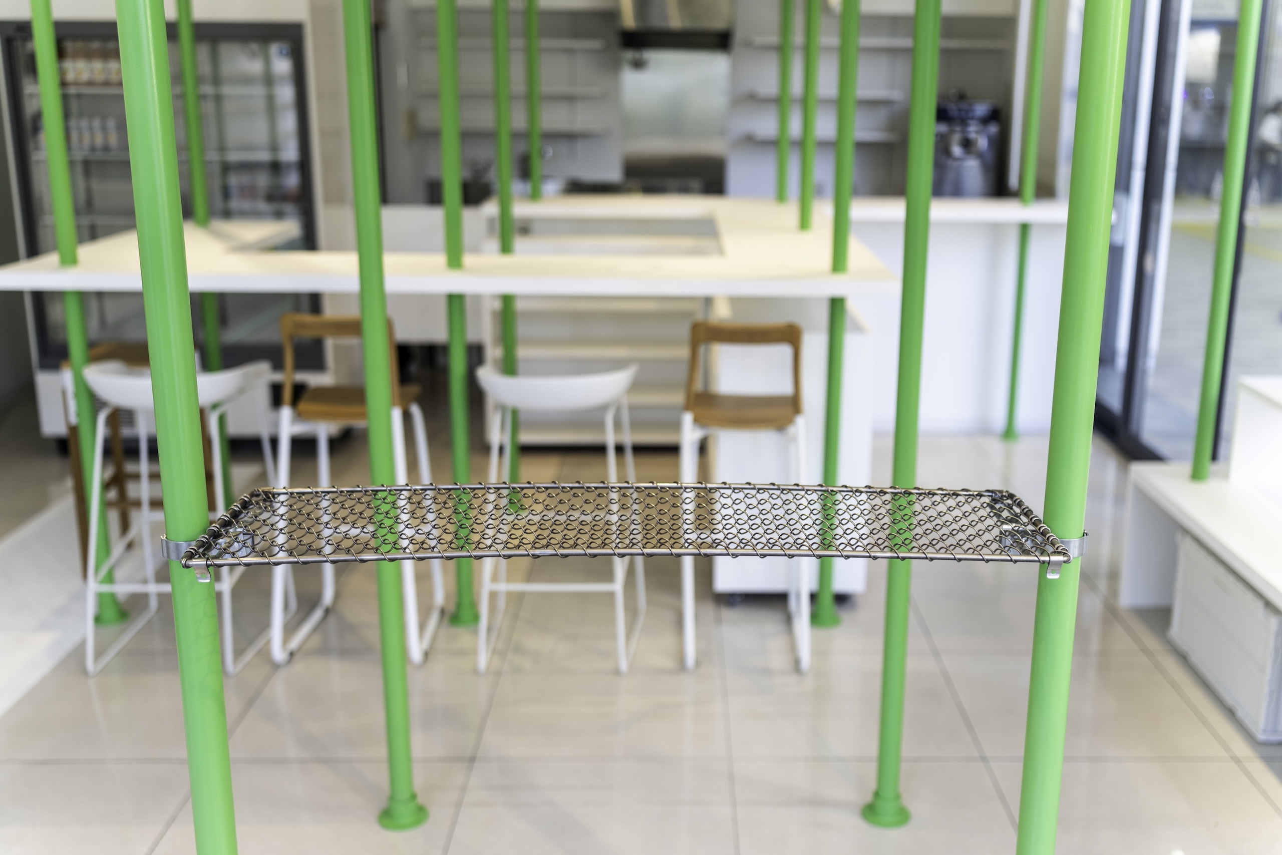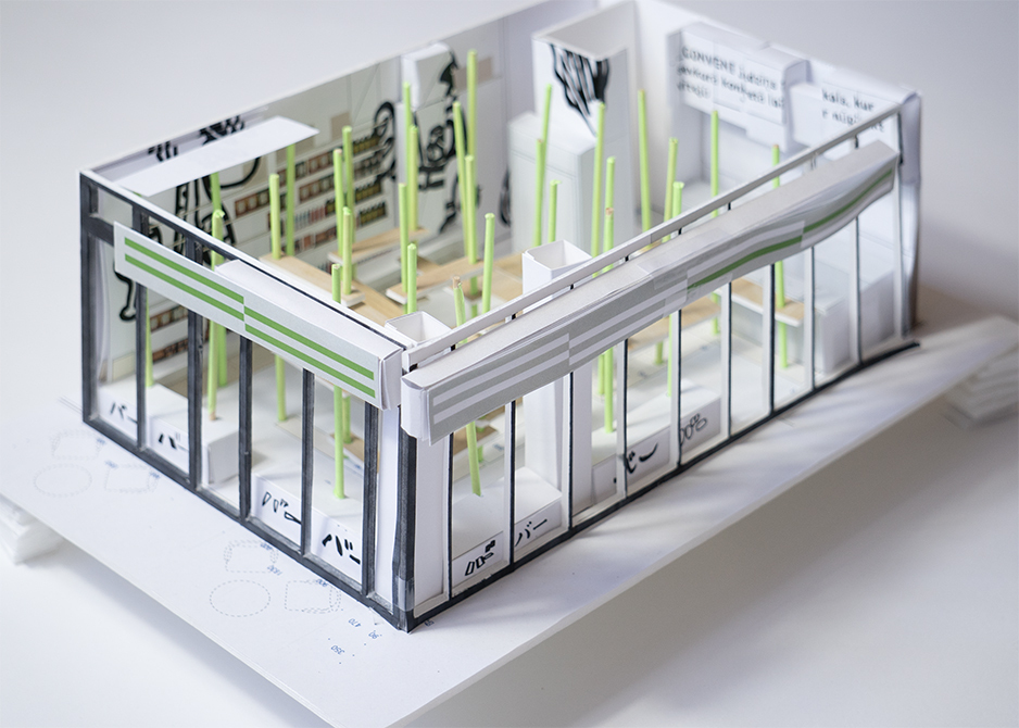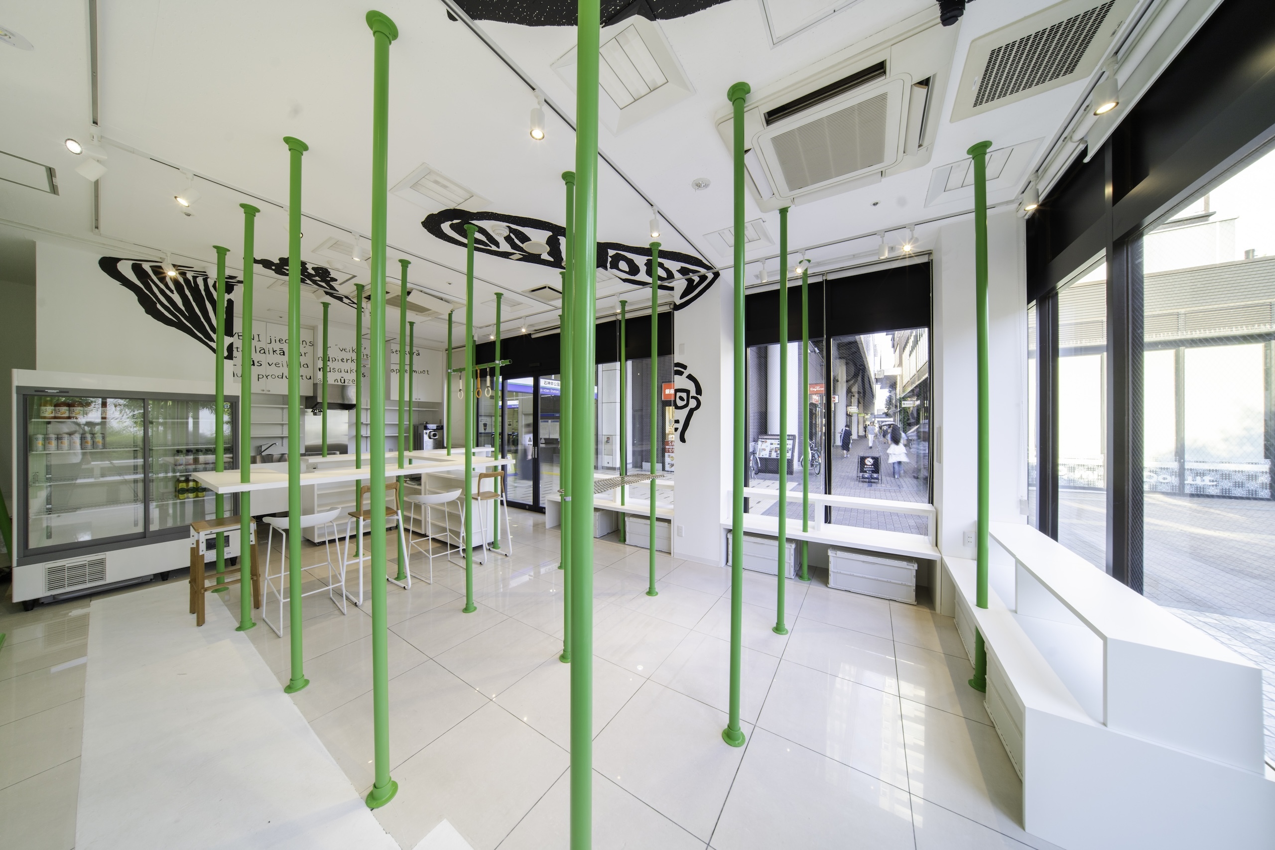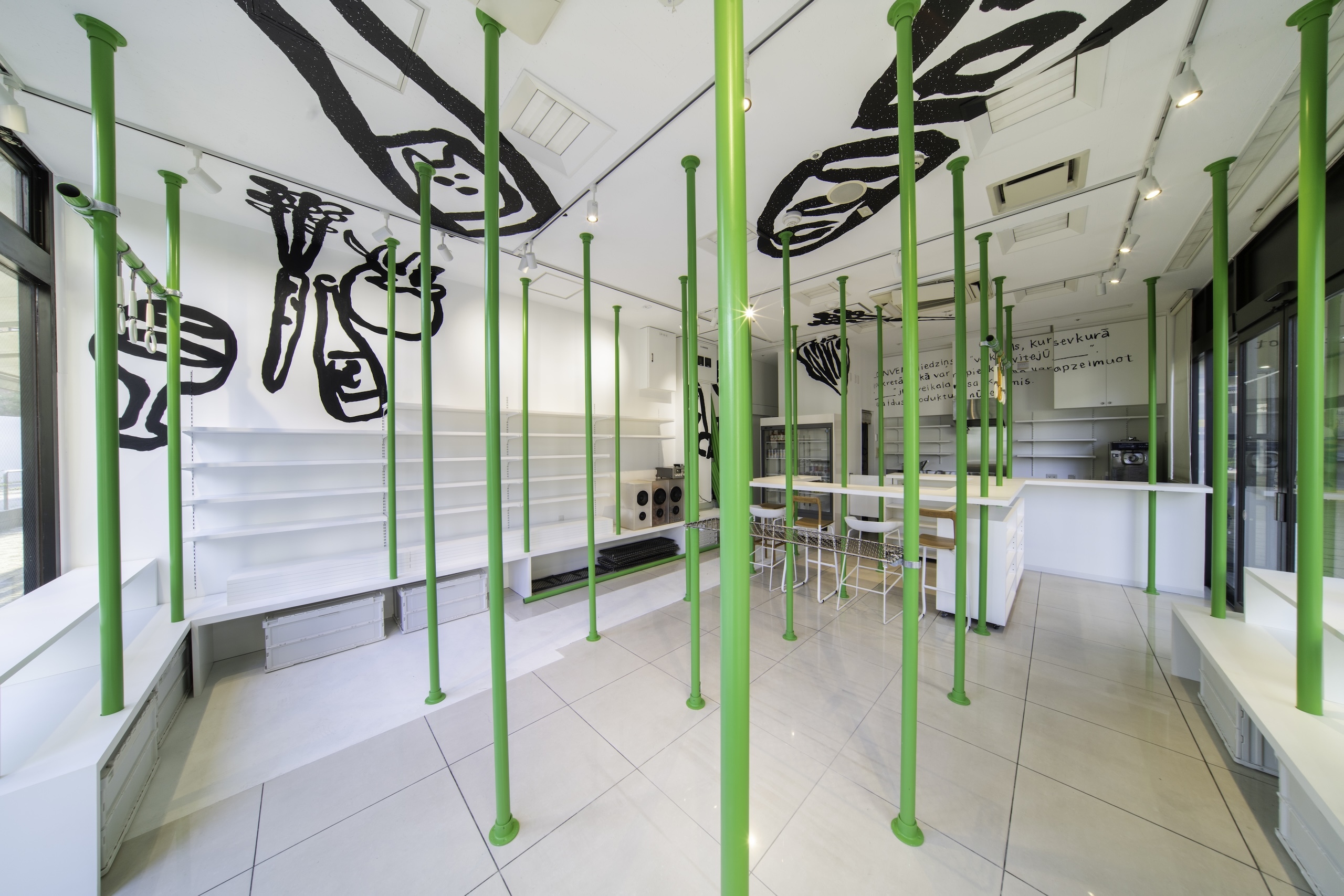 The fluorescent green bar transforms into steel pipes that define the structure of the interior, while the black hand-drawn lines are enlarged and directly drawn onto walls and ceilings, creating a distinctive and immersive atmosphere.