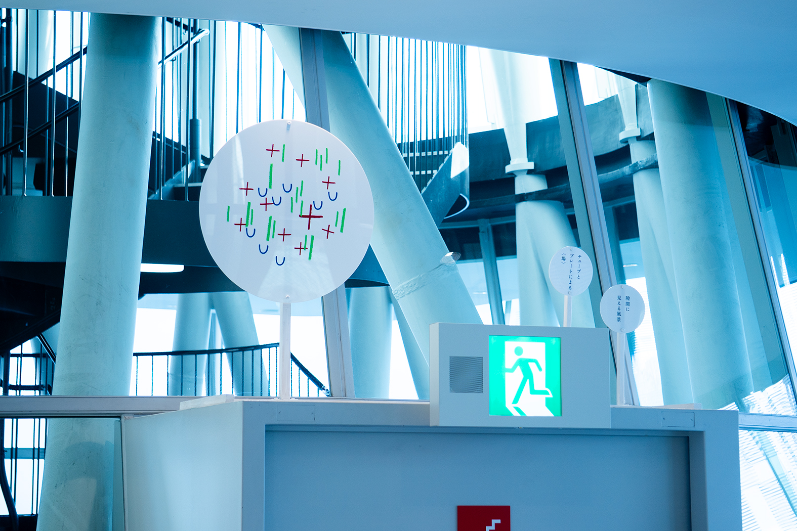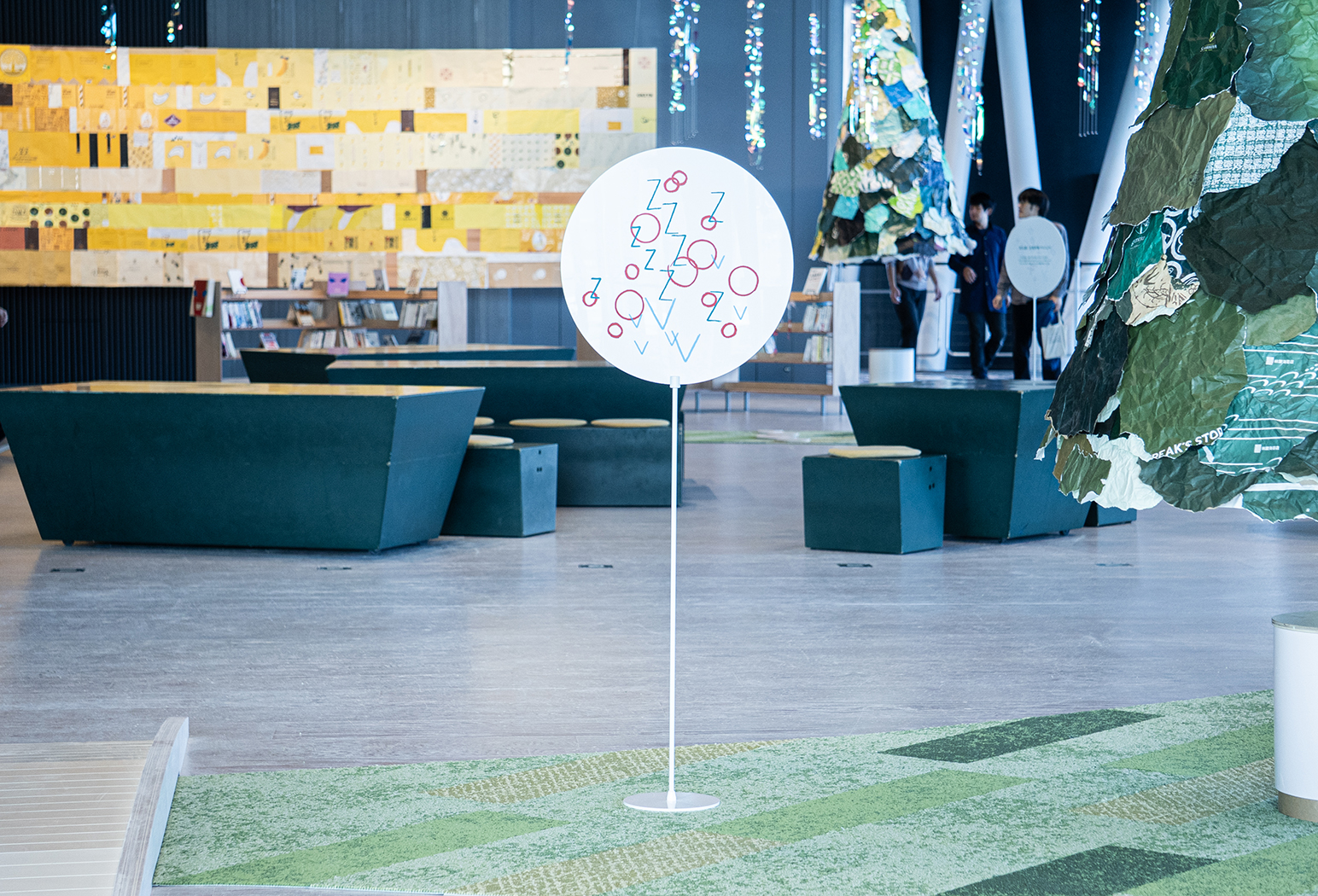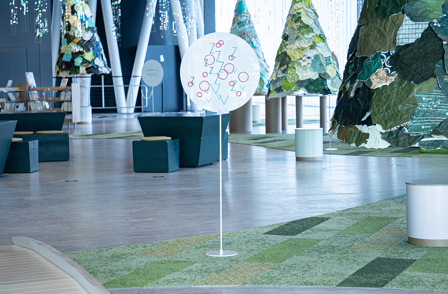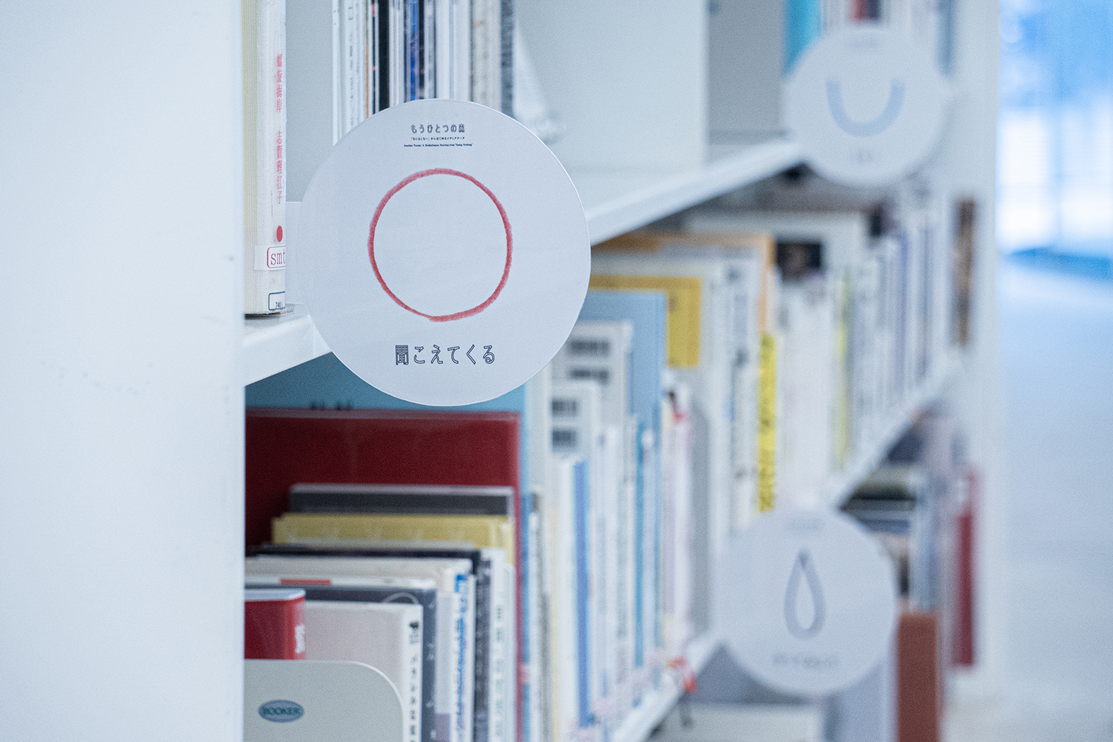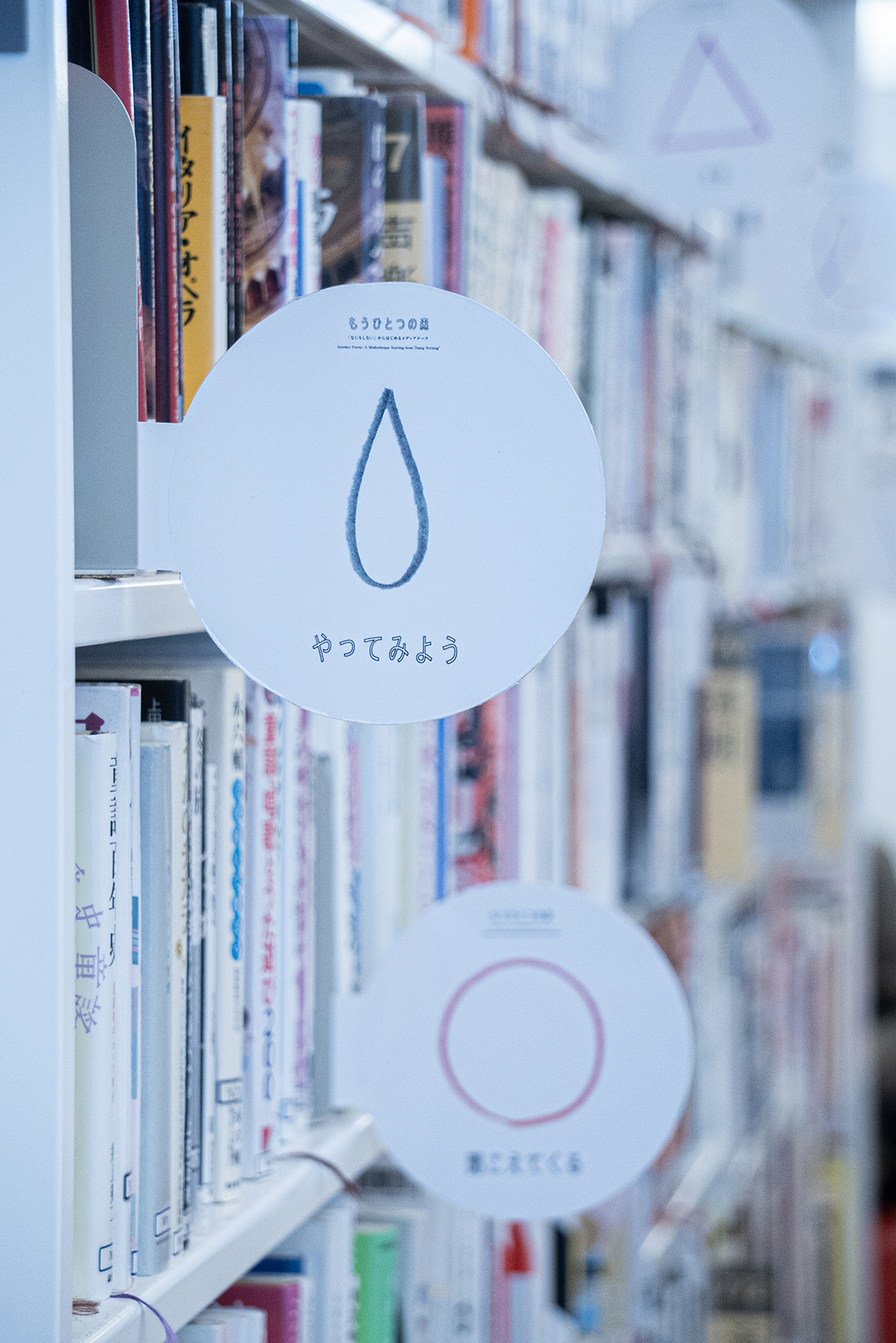 今回、6階の展示室だけでなく、地下から7階まで、メディアテークの各場所にキービジュアルのエレメントのオブジェサインが点在しています。3階図書館にも限定書棚にオブジェクトがサインとして配置されています。