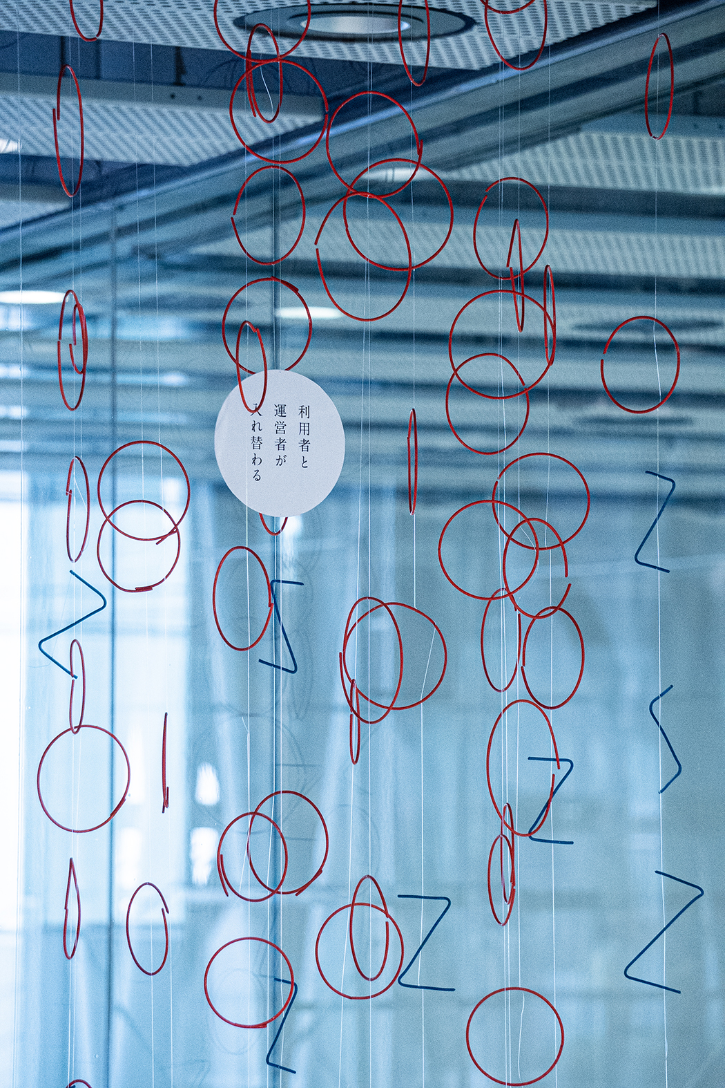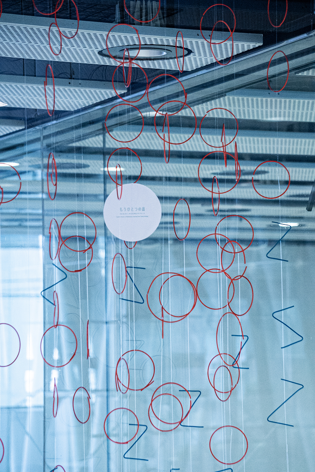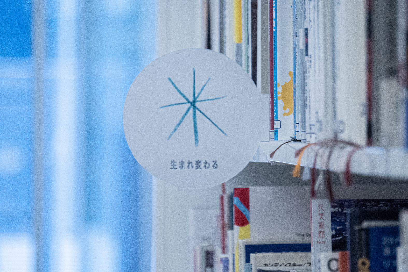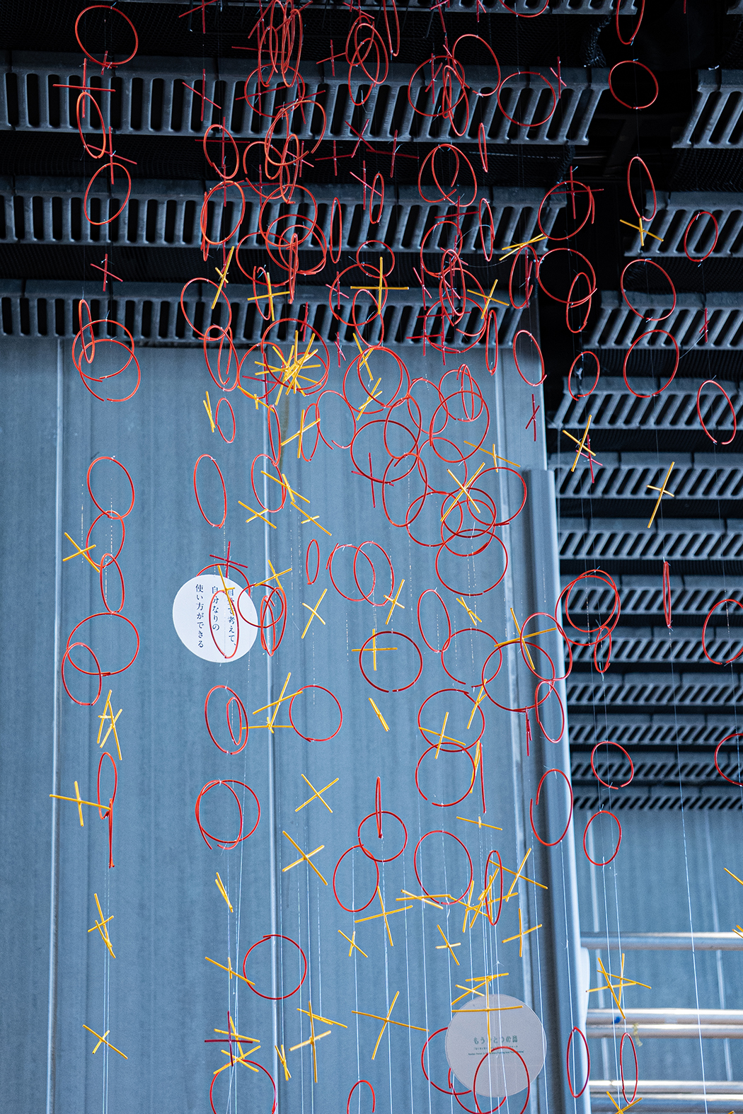 今回、6階の展示室だけでなく、地下から7階まで、メディアテークの各場所にキービジュアルのエレメントのオブジェサインが点在しています。3階図書館にも限定書棚にオブジェクトがサインとして配置されています。