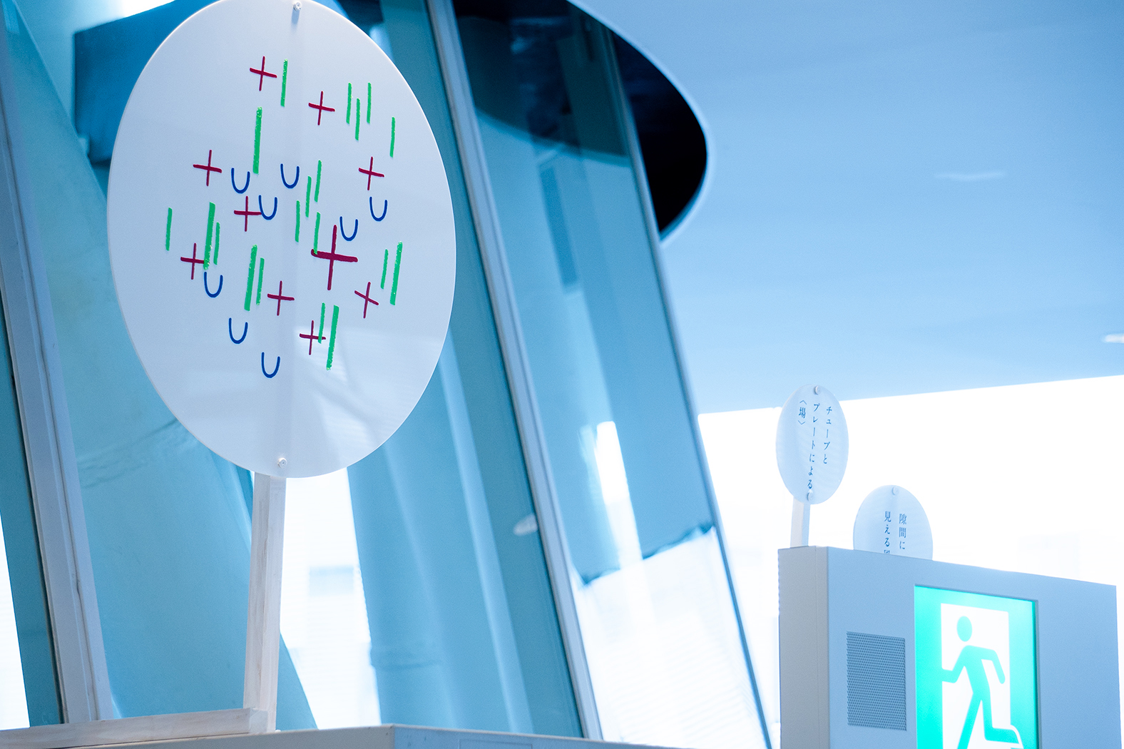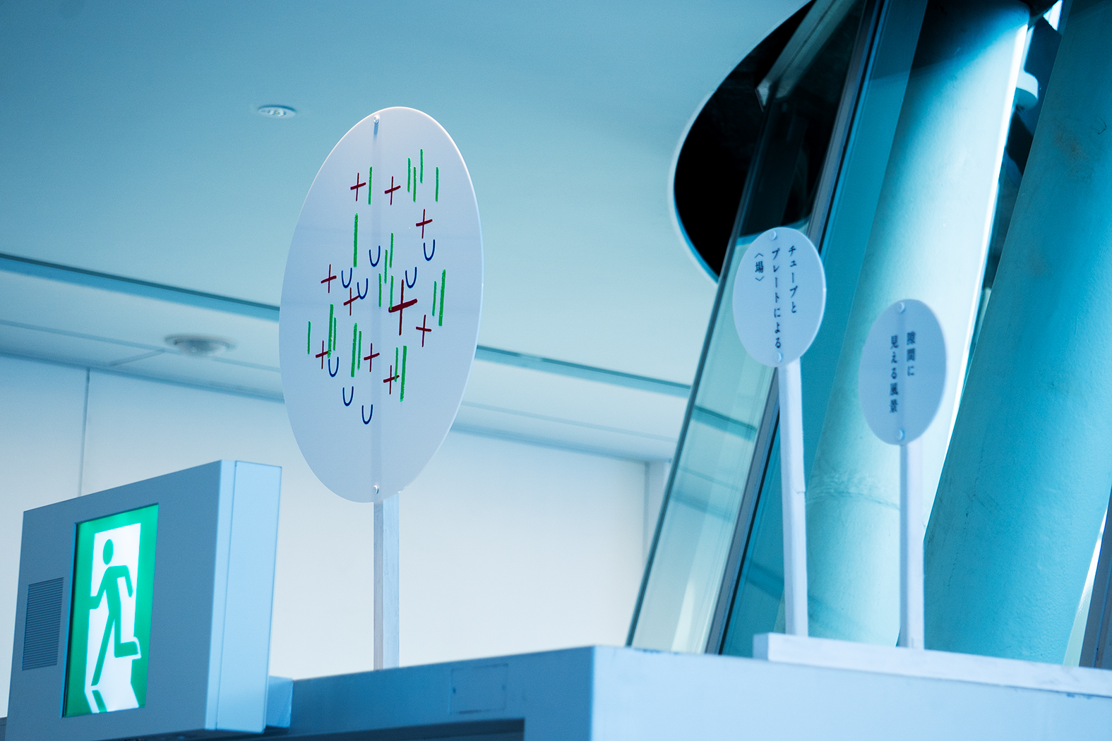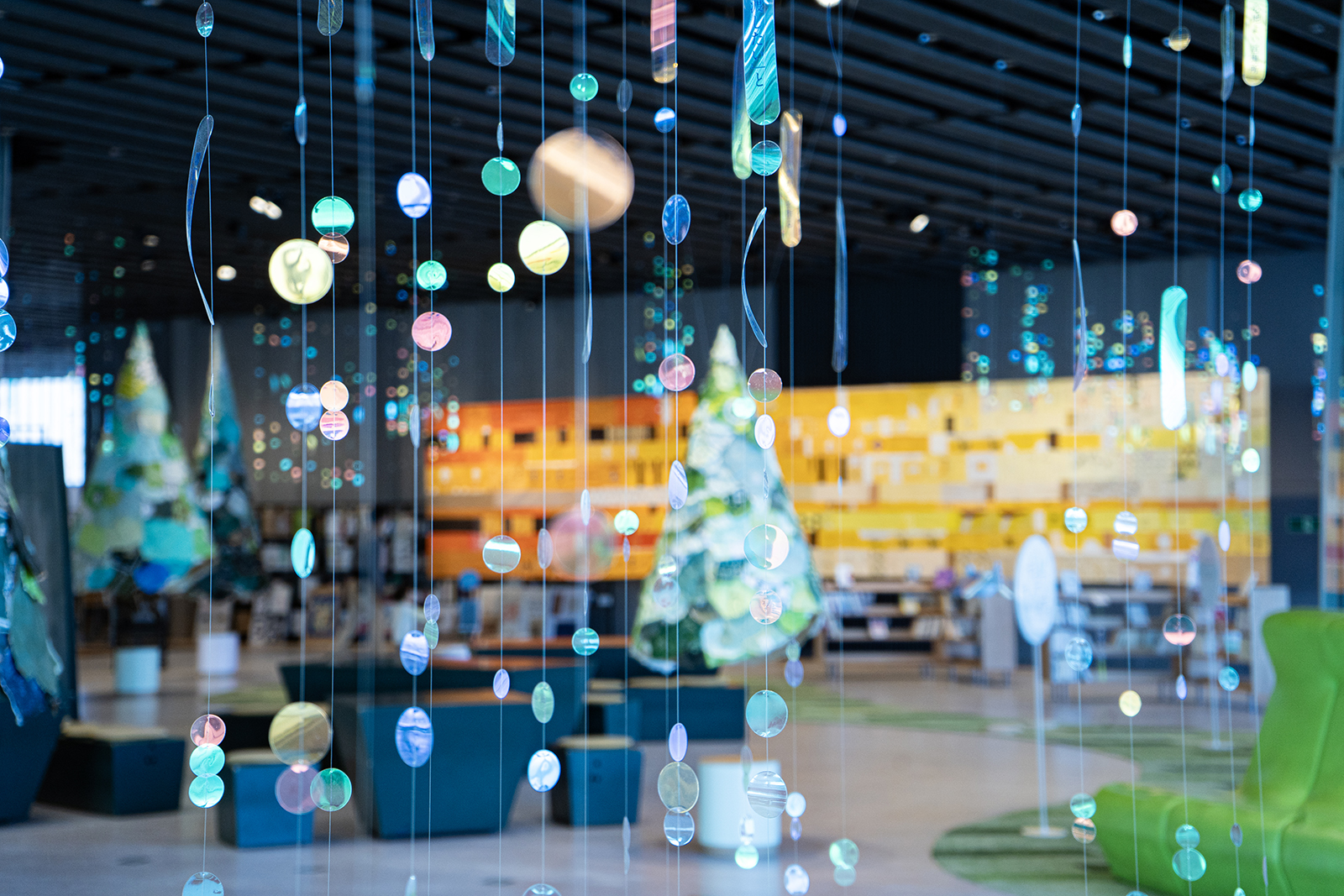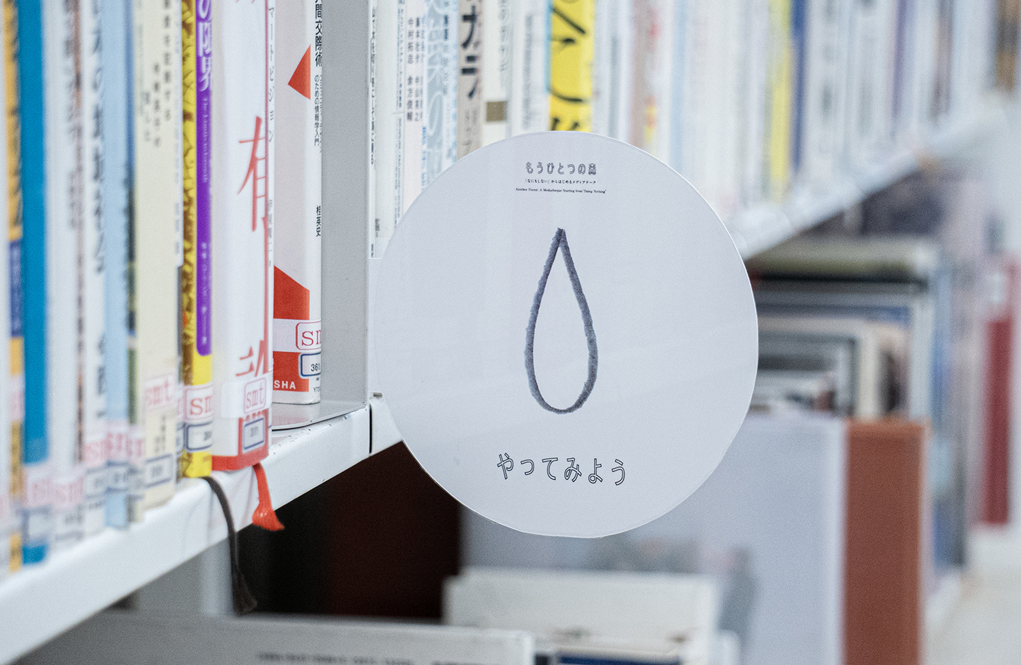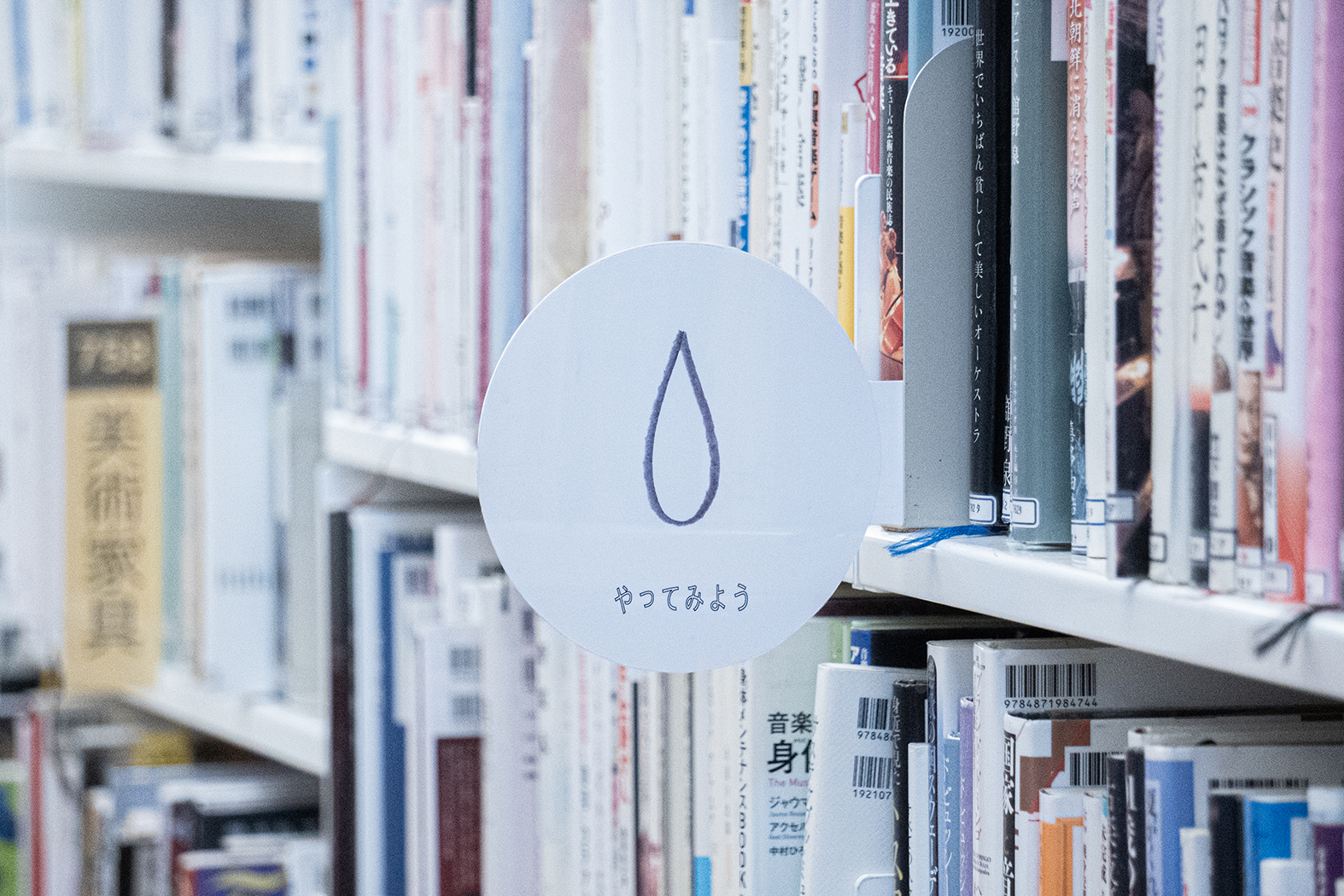 今回、6階の展示室だけでなく、地下から7階まで、メディアテークの各場所にキービジュアルのエレメントのオブジェサインが点在しています。3階図書館にも限定書棚にオブジェクトがサインとして配置されています。