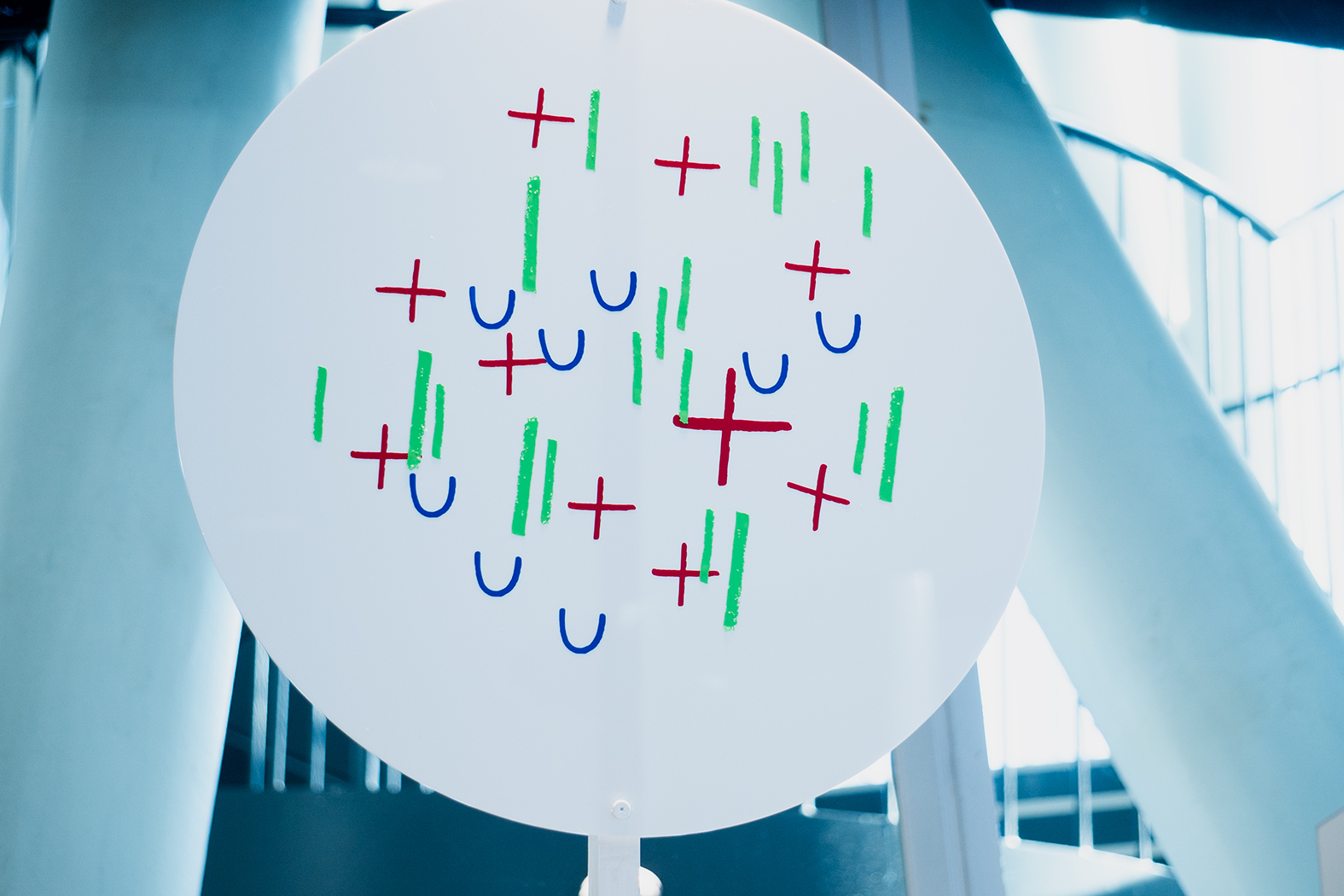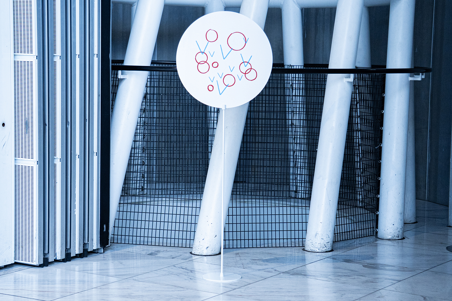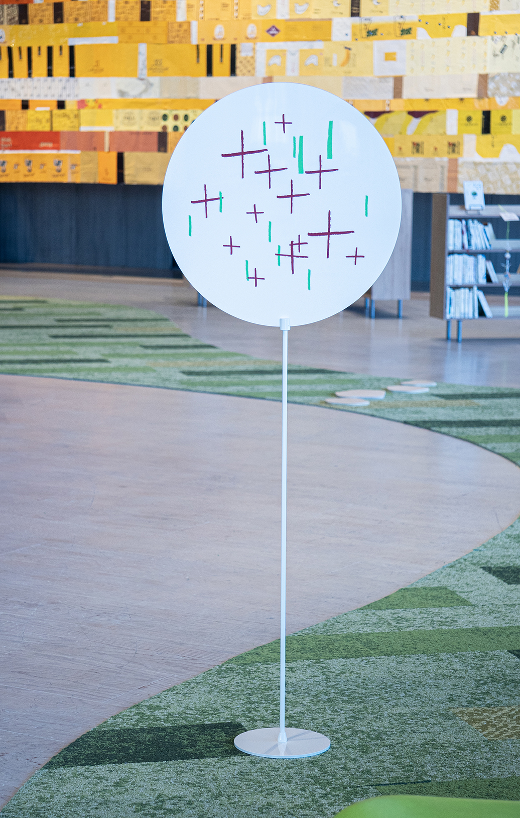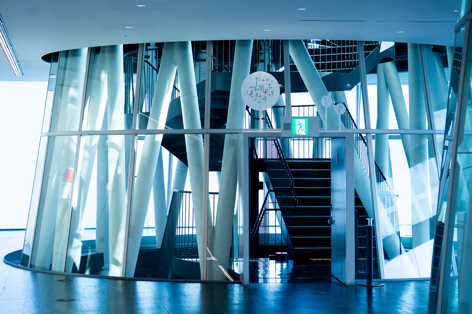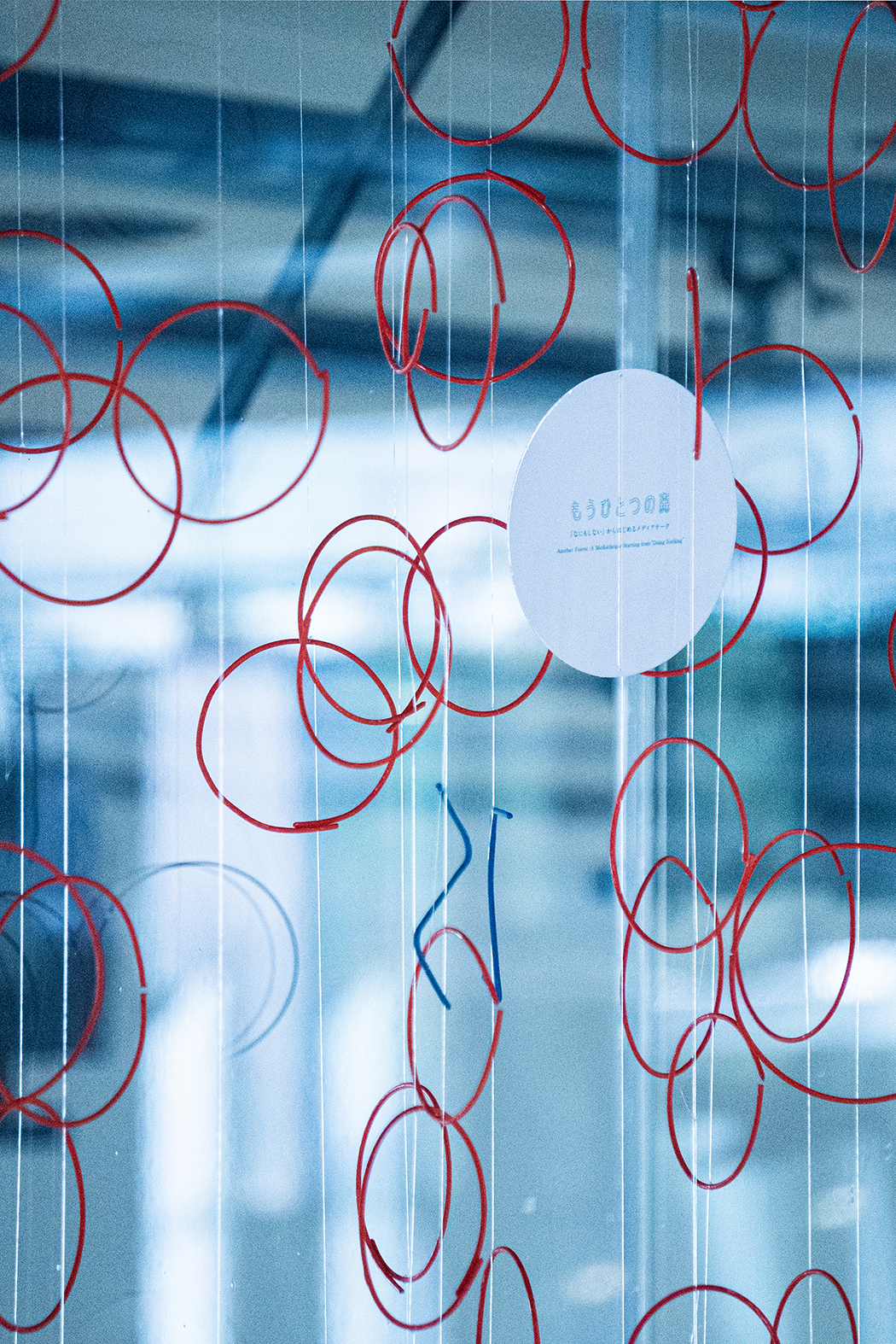 今回、6階の展示室だけでなく、地下から7階まで、メディアテークの各場所にキービジュアルのエレメントのオブジェサインが点在しています。3階図書館にも限定書棚にオブジェクトがサインとして配置されています。