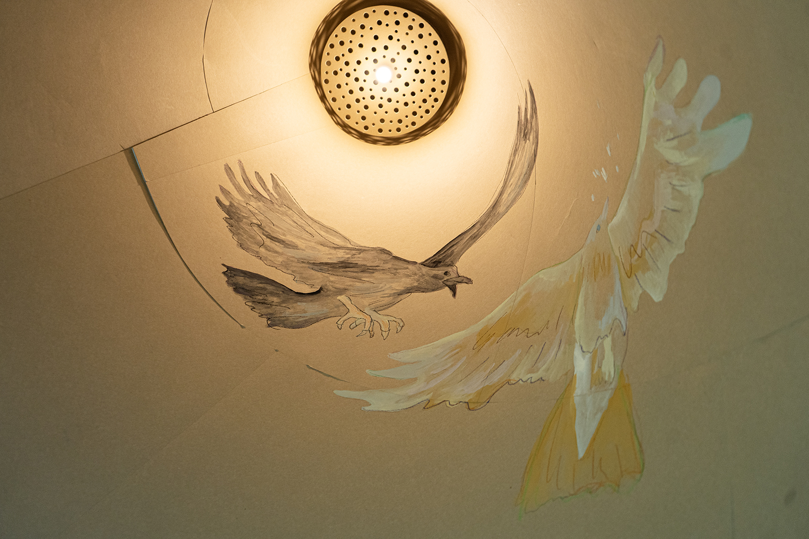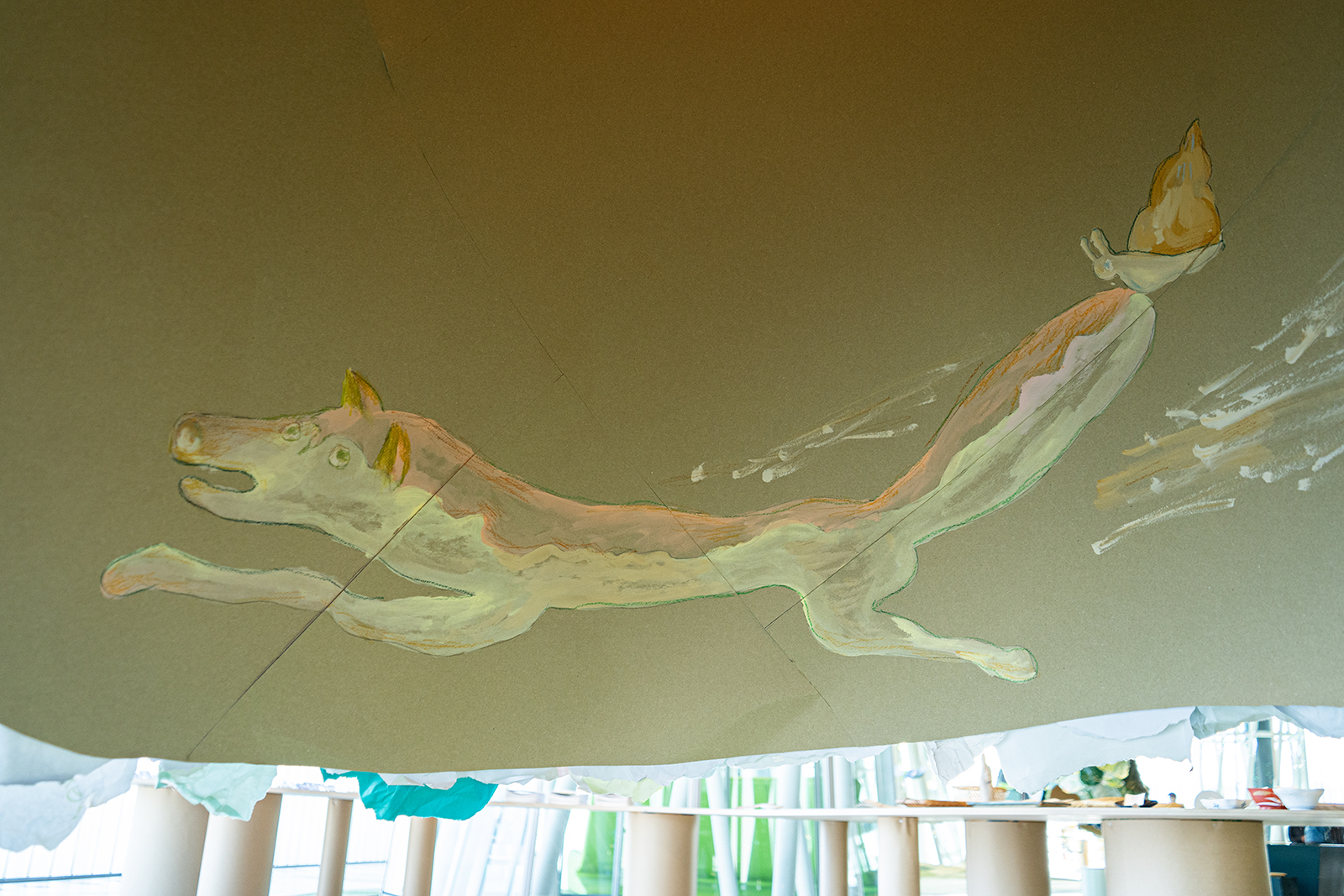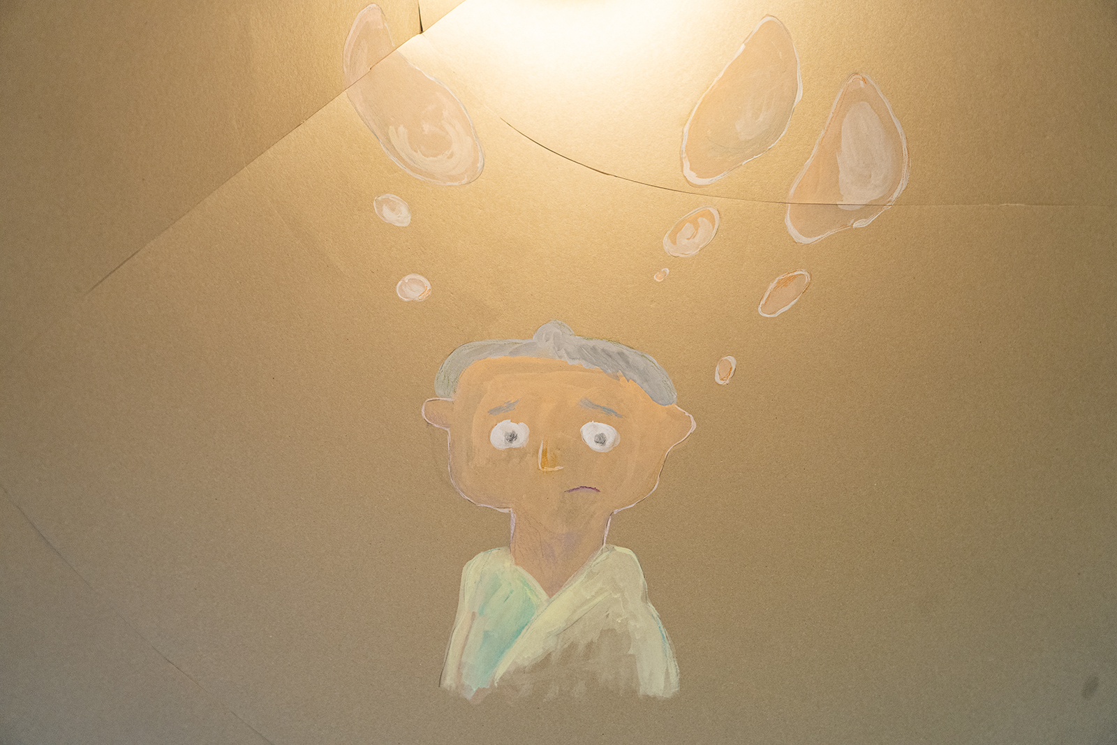 民話が流れる、民話ハットの中の絵は、民話を聞きながら、平野と山本と赤間で描きました。宮城弁の訛りが心地よいです。